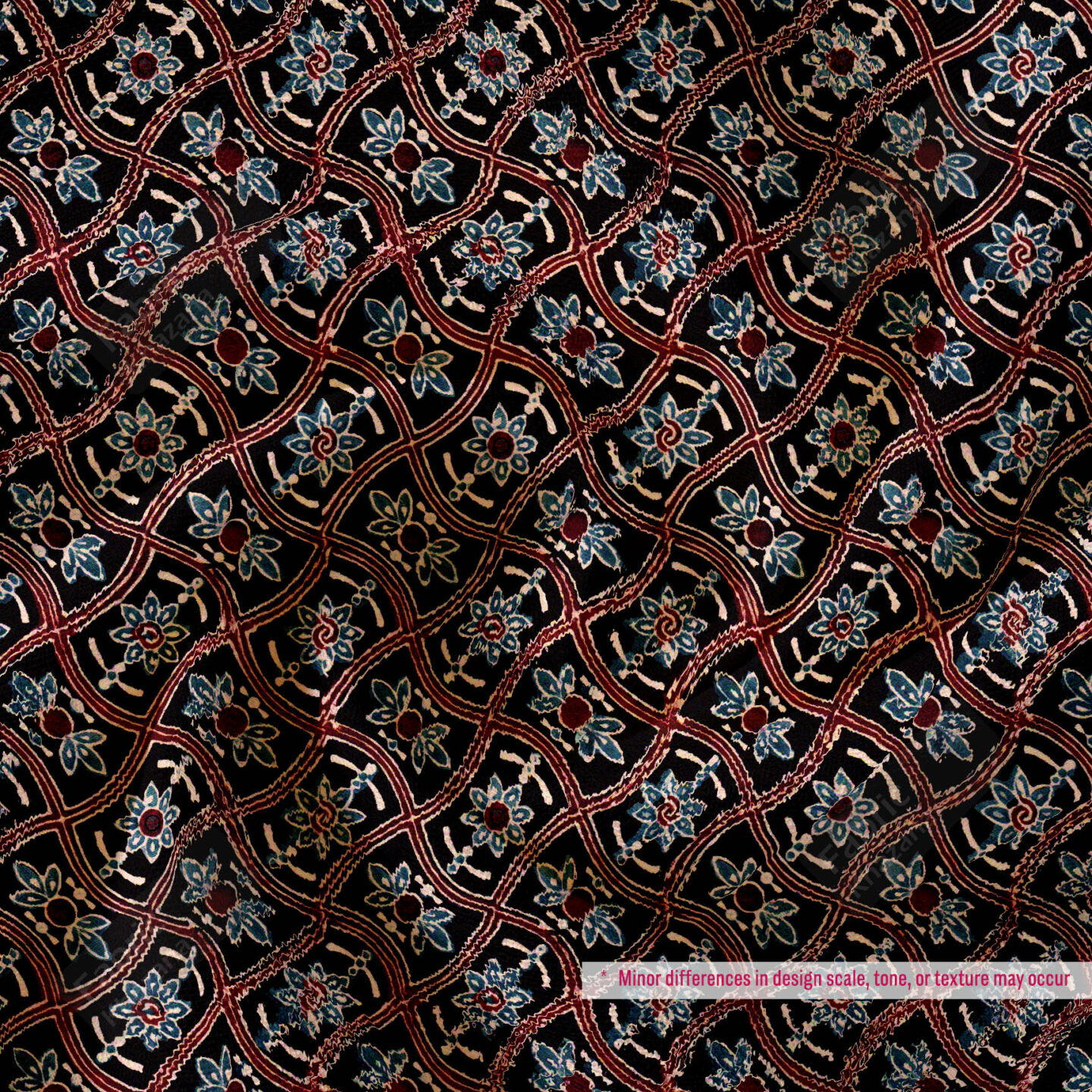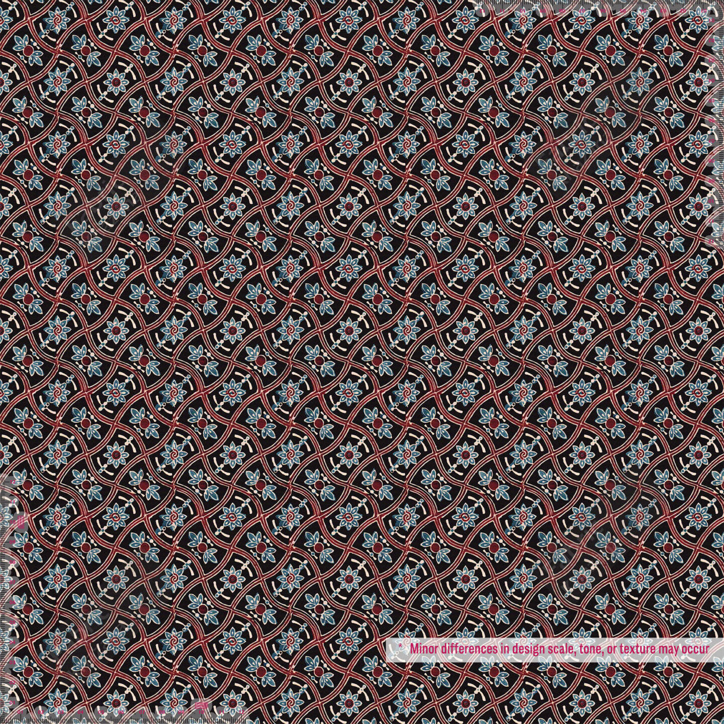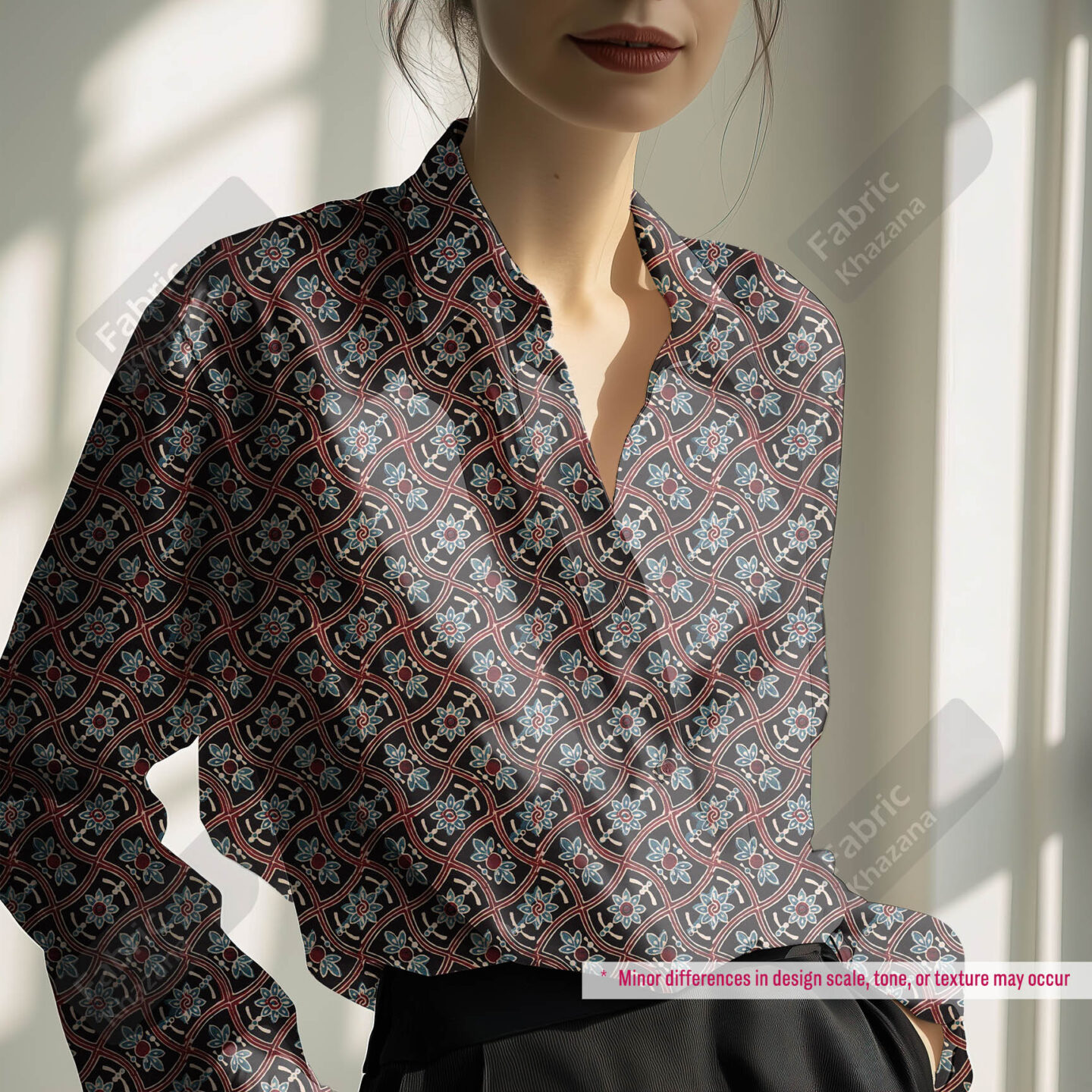 Add timeless charm to your creations with this maroon and blue geometric floral printed polyester fabric. The delicate floral motifs outlined in maroon latticework bring a sophisticated ethnic appeal while maintaining a modern edge.