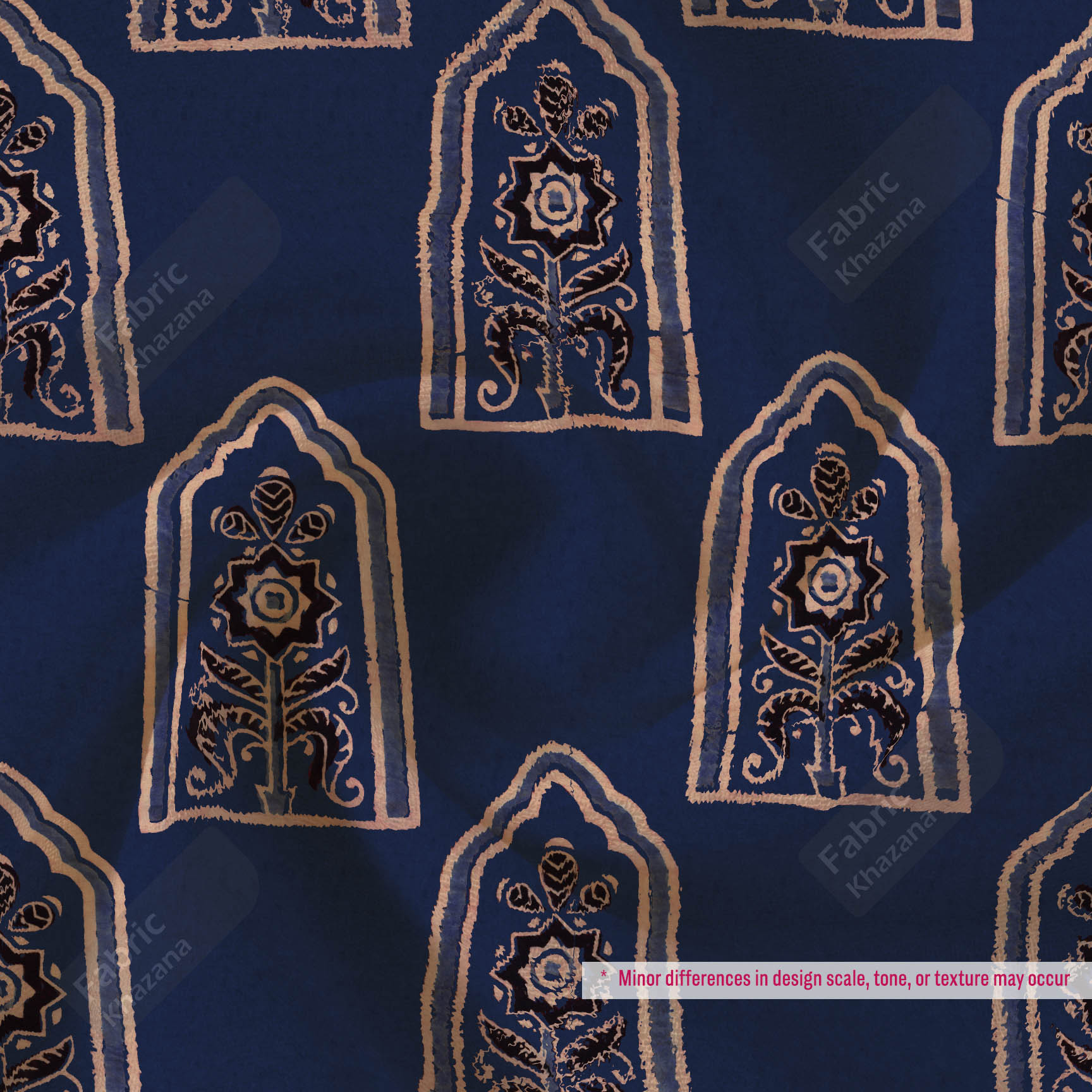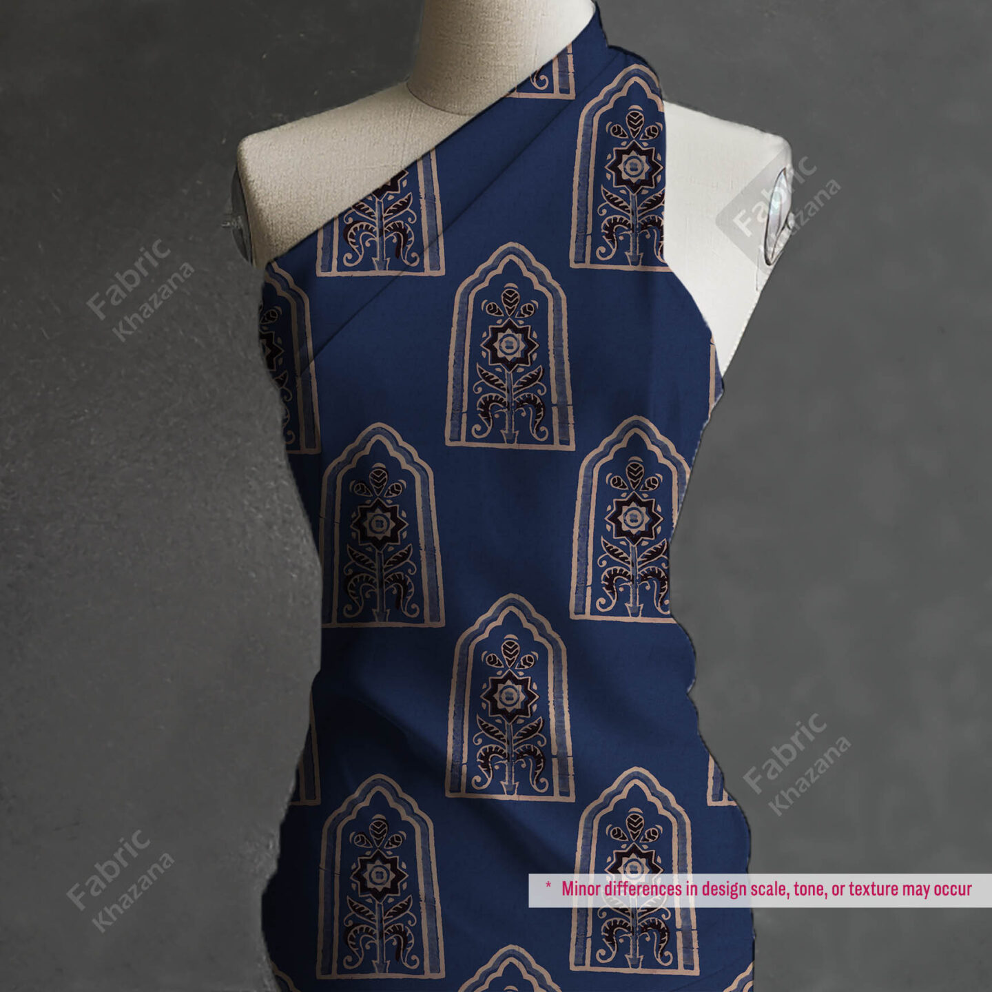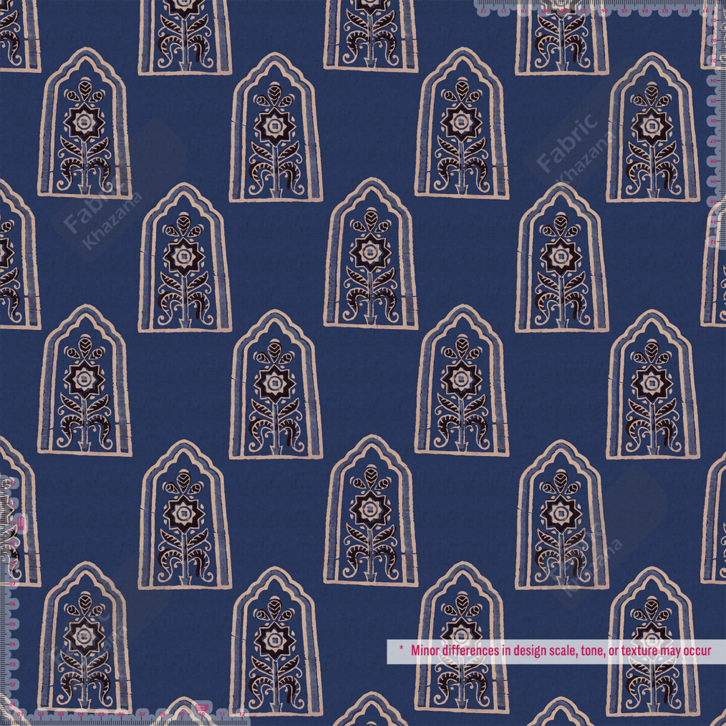Bring the grace of Indian artistry into your creations with this blue and beige polyester fabric featuring floral arch prints reminiscent of Mughal windows and jaali patterns. The detailed beige design on a rich blue backdrop exudes cultural elegance and sophistication.