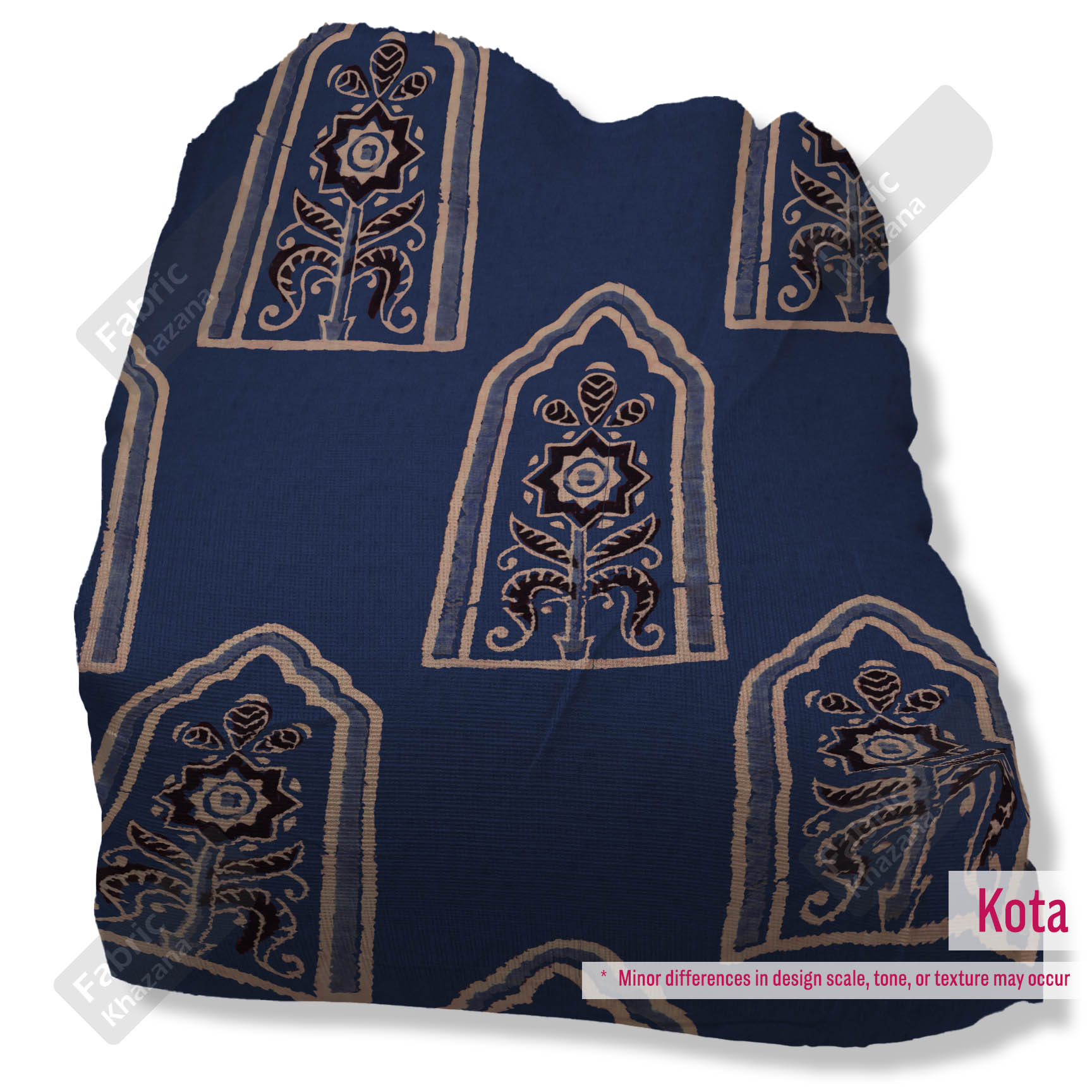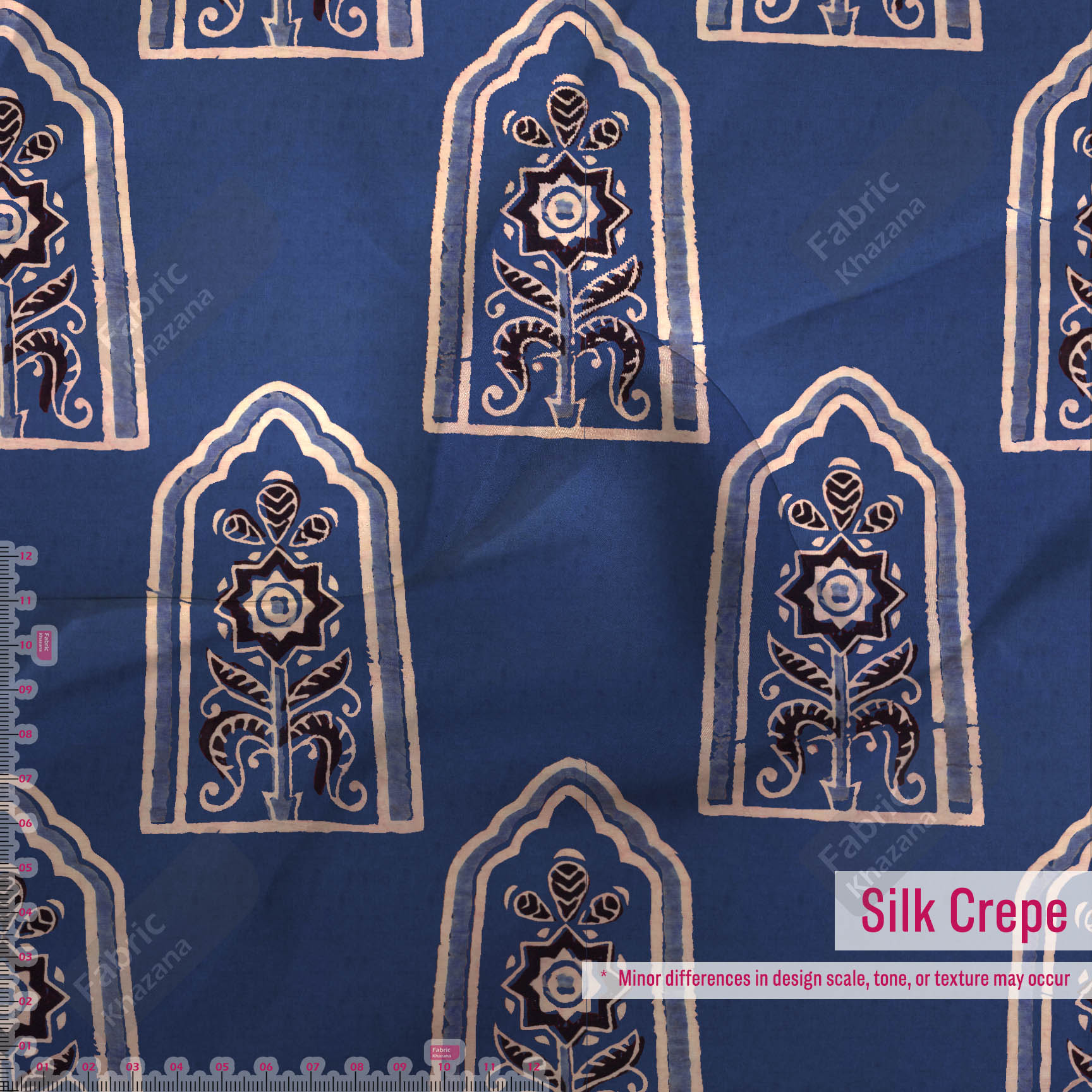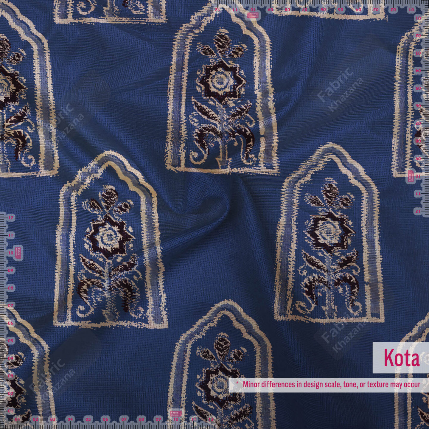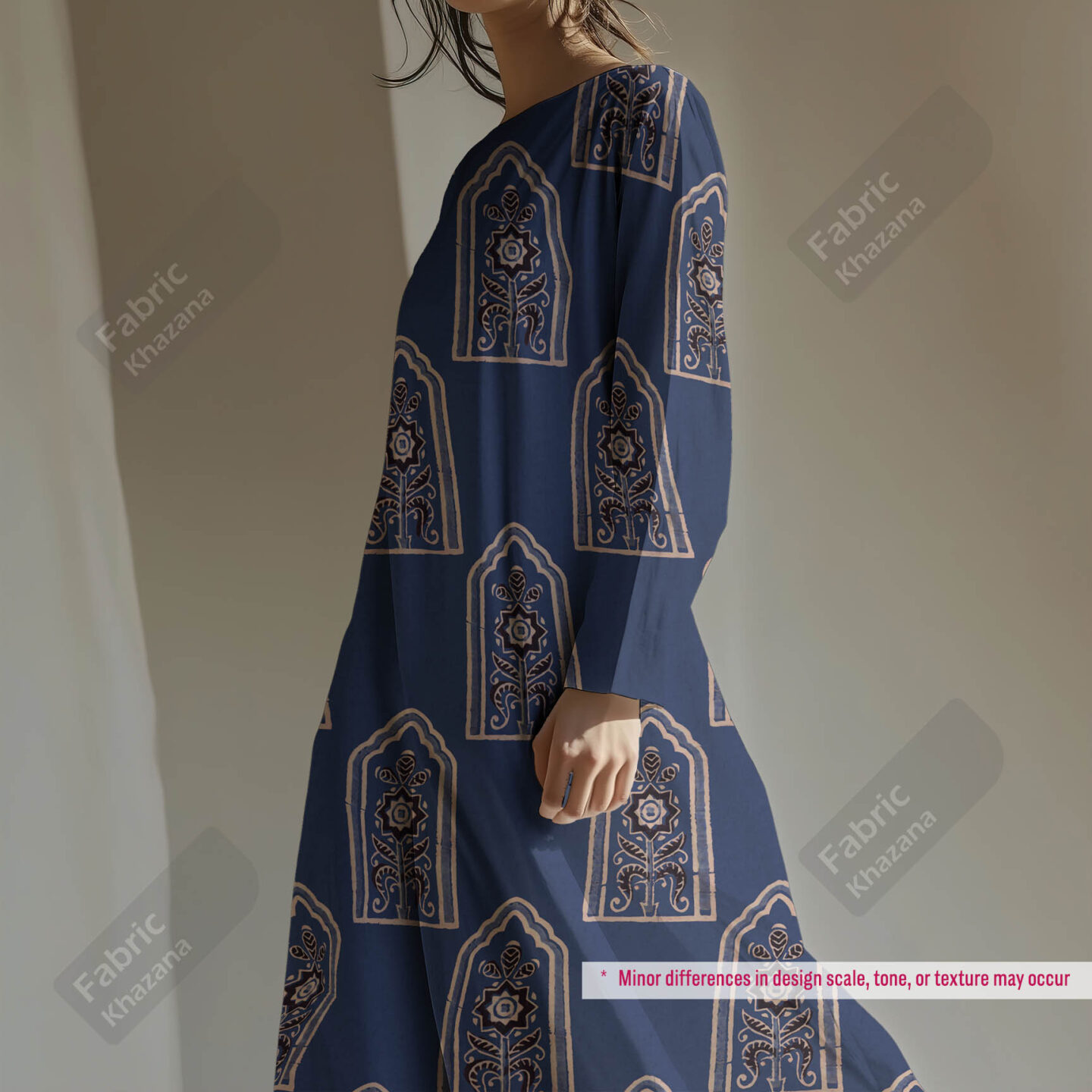 Bring the grace of Indian artistry into your creations with this blue and beige polyester fabric featuring floral arch prints reminiscent of Mughal windows and jaali patterns. The detailed beige design on a rich blue backdrop exudes cultural elegance and sophistication.
