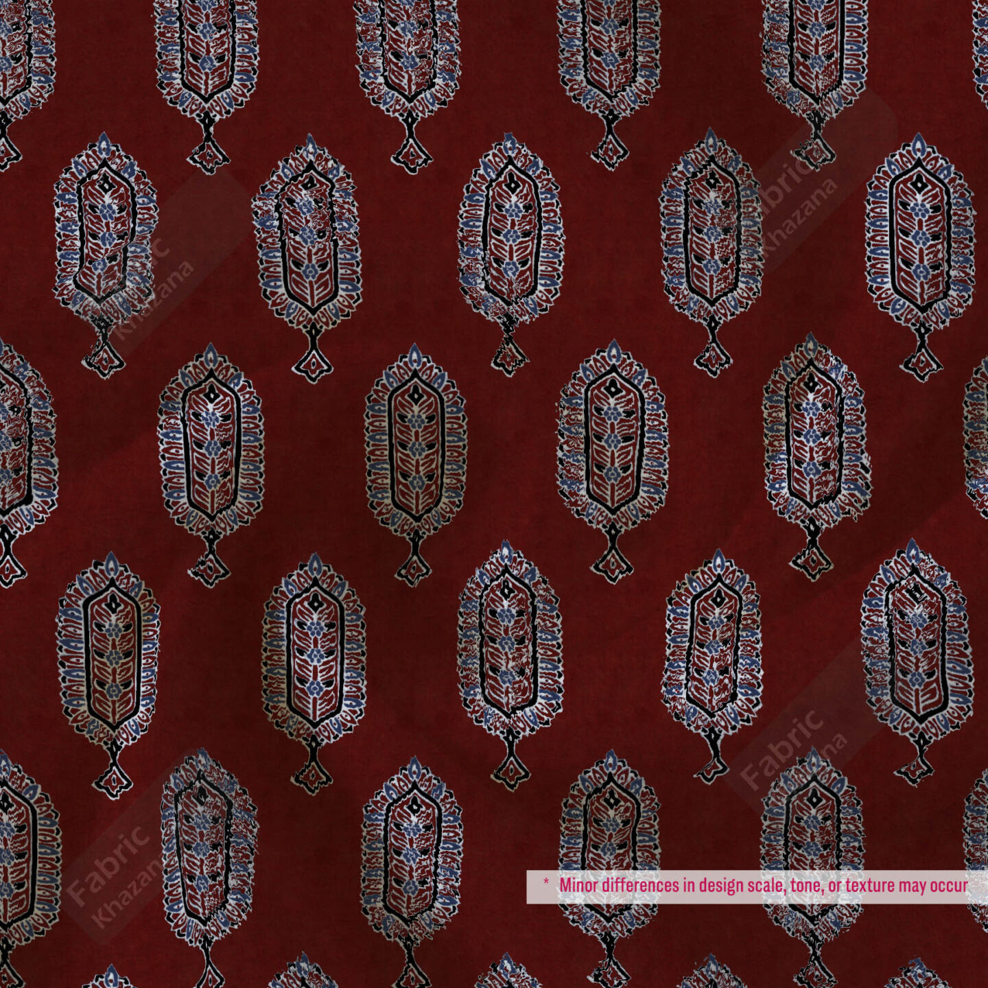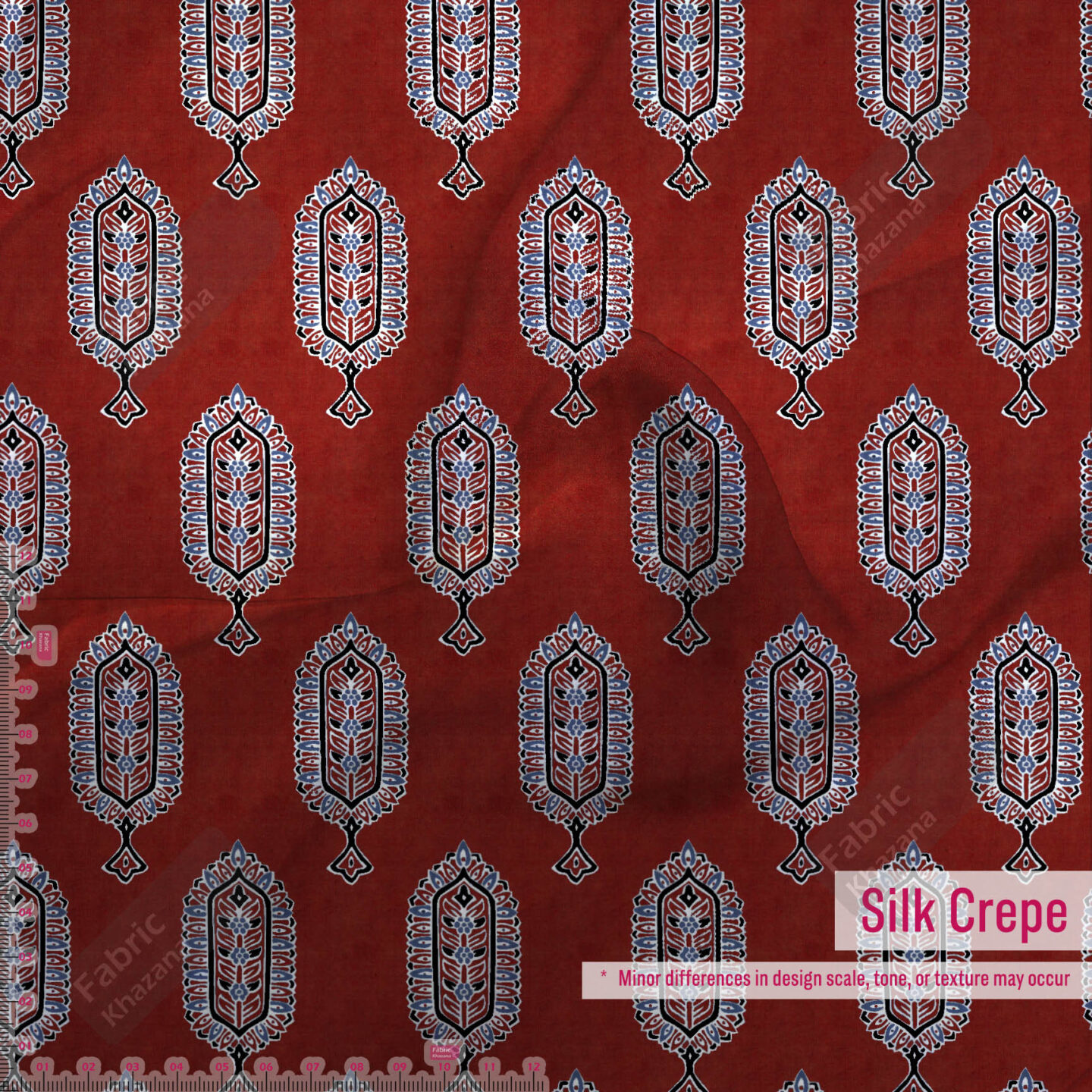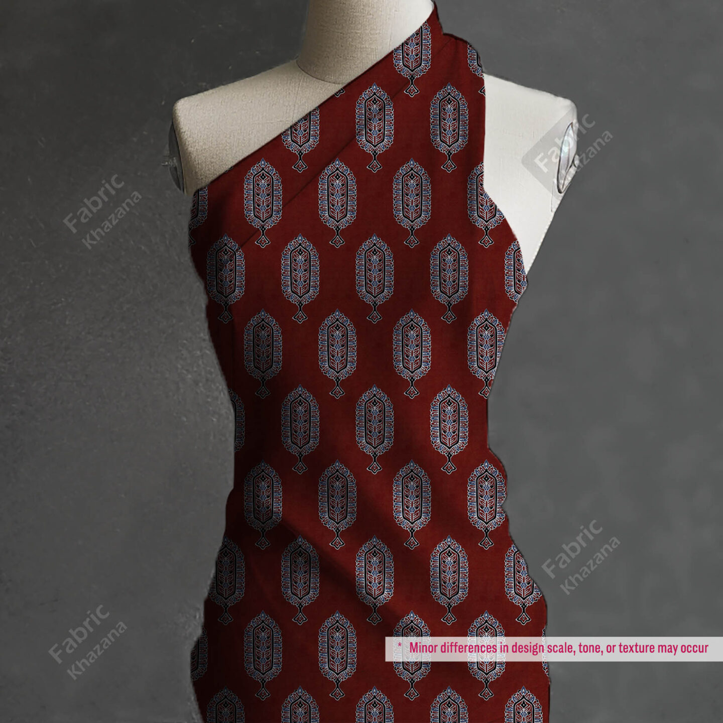 Add grace and tradition to your creations with this elegant red and blue printed polyester fabric. The design draws inspiration from nature, featuring detailed leaf motifs that bring freshness and beauty to your wardrobe.