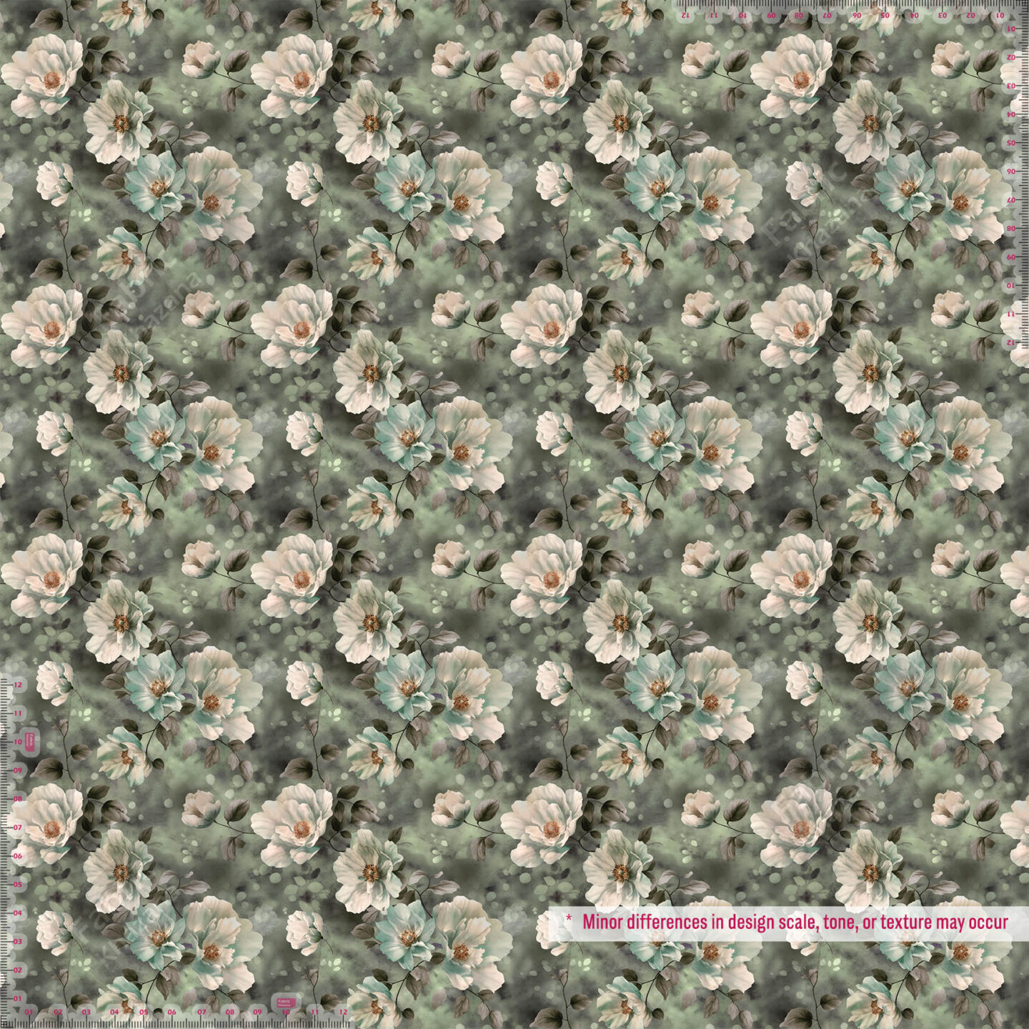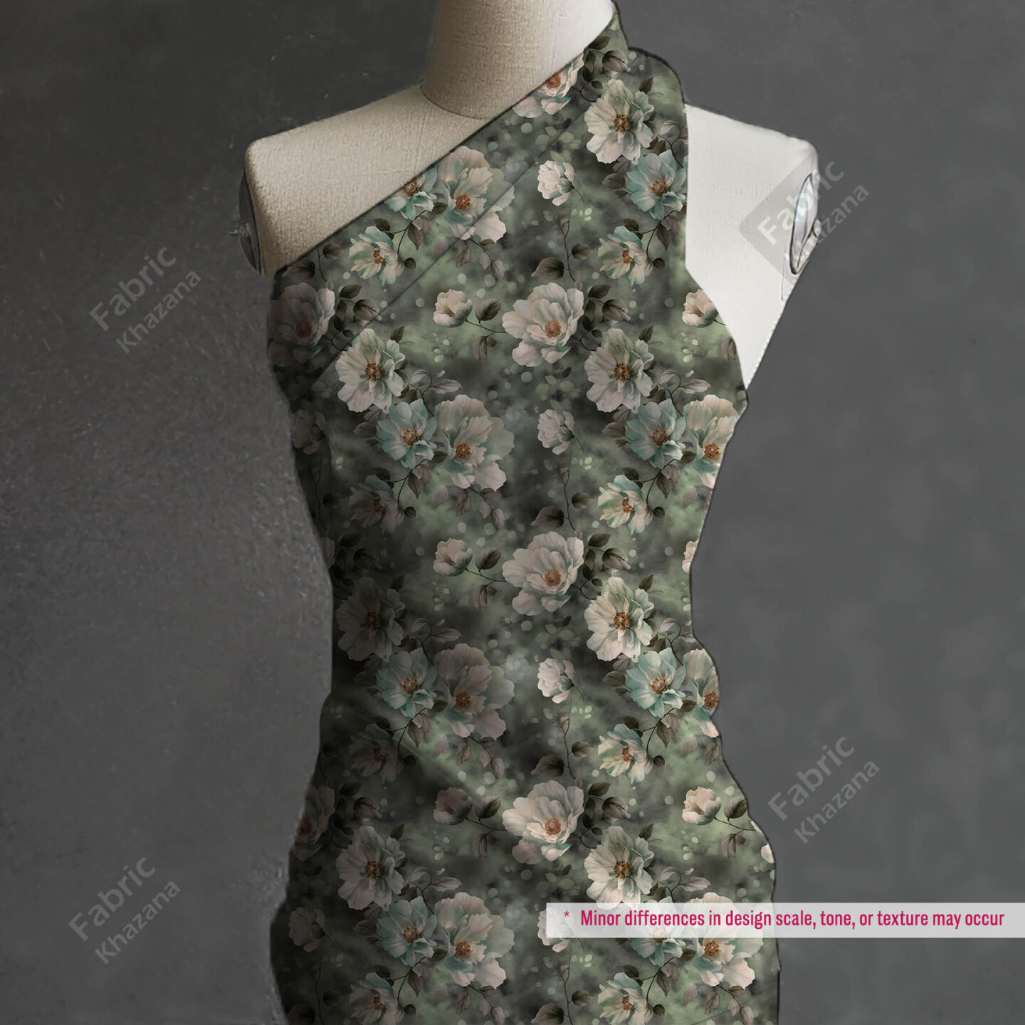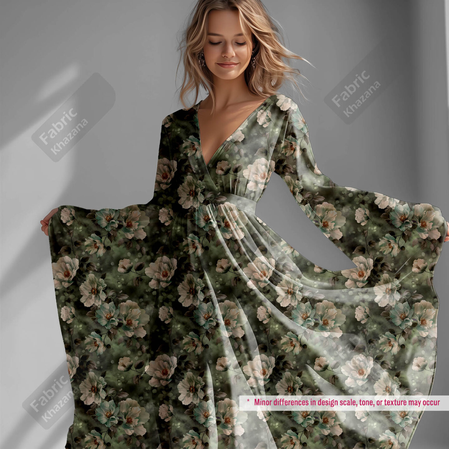 Embrace elegance with this Green Floral Printed Polyester Fabric, a perfect blend of sophistication and comfort. The soft beige floral patterns bloom gracefully across the rich green background, evoking a hand-painted charm that makes this fabric timeless and versatile.
