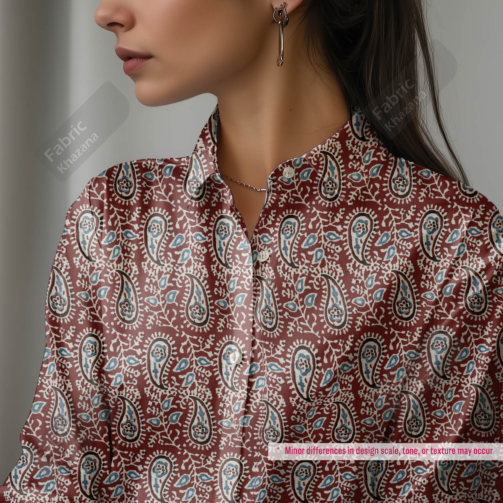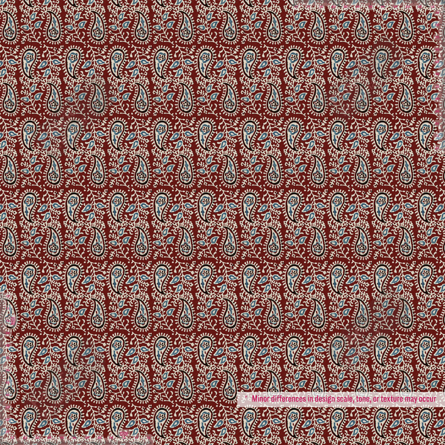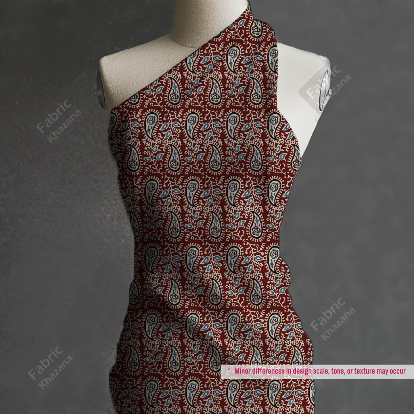 Add a regal touch to your creations with this maroon paisley printed polyester fabric, inspired by classic Indian motifs and modern aesthetics. The intricate blue and beige paisley pattern stands out beautifully against the deep maroon base, creating a luxurious and elegant look that suits all occasions.