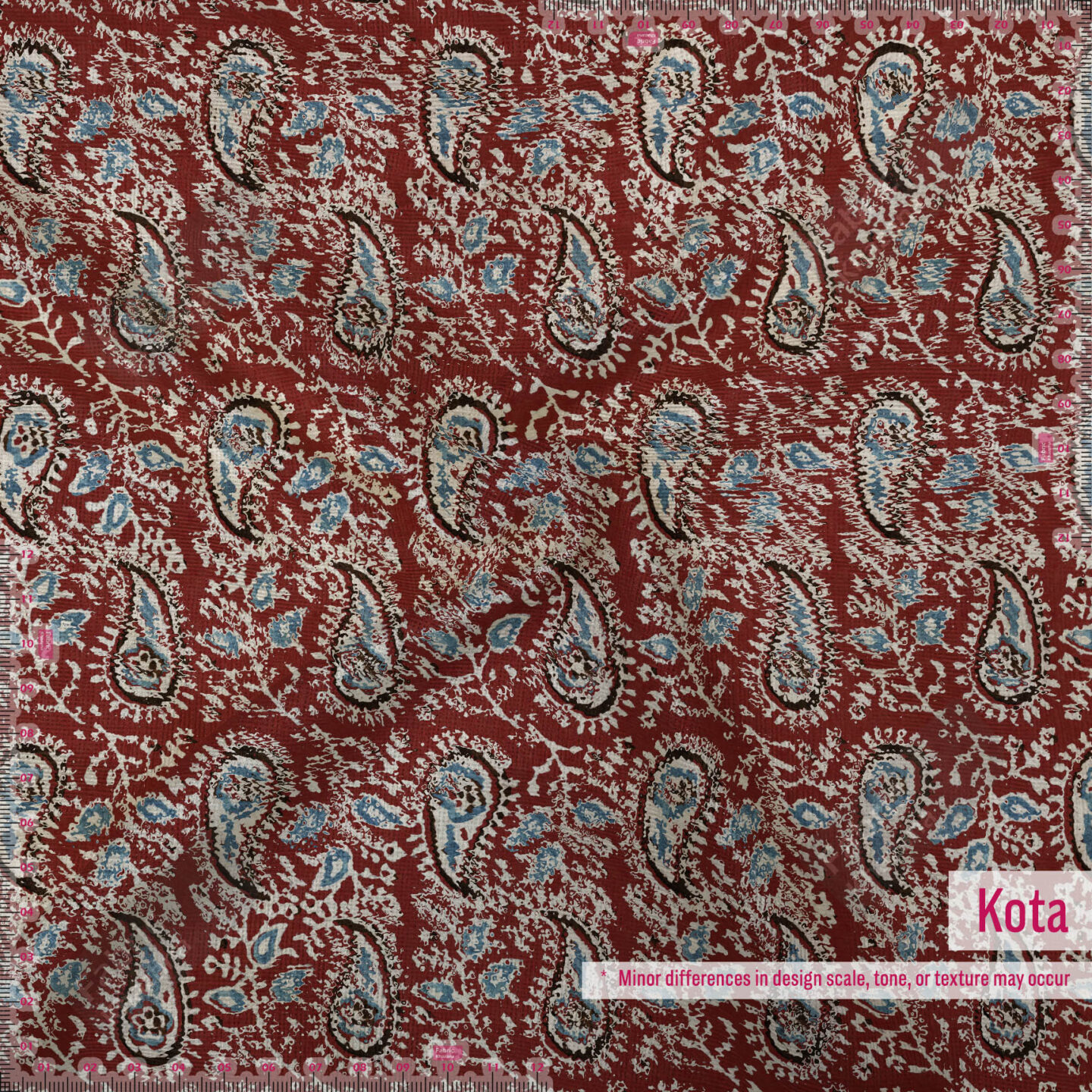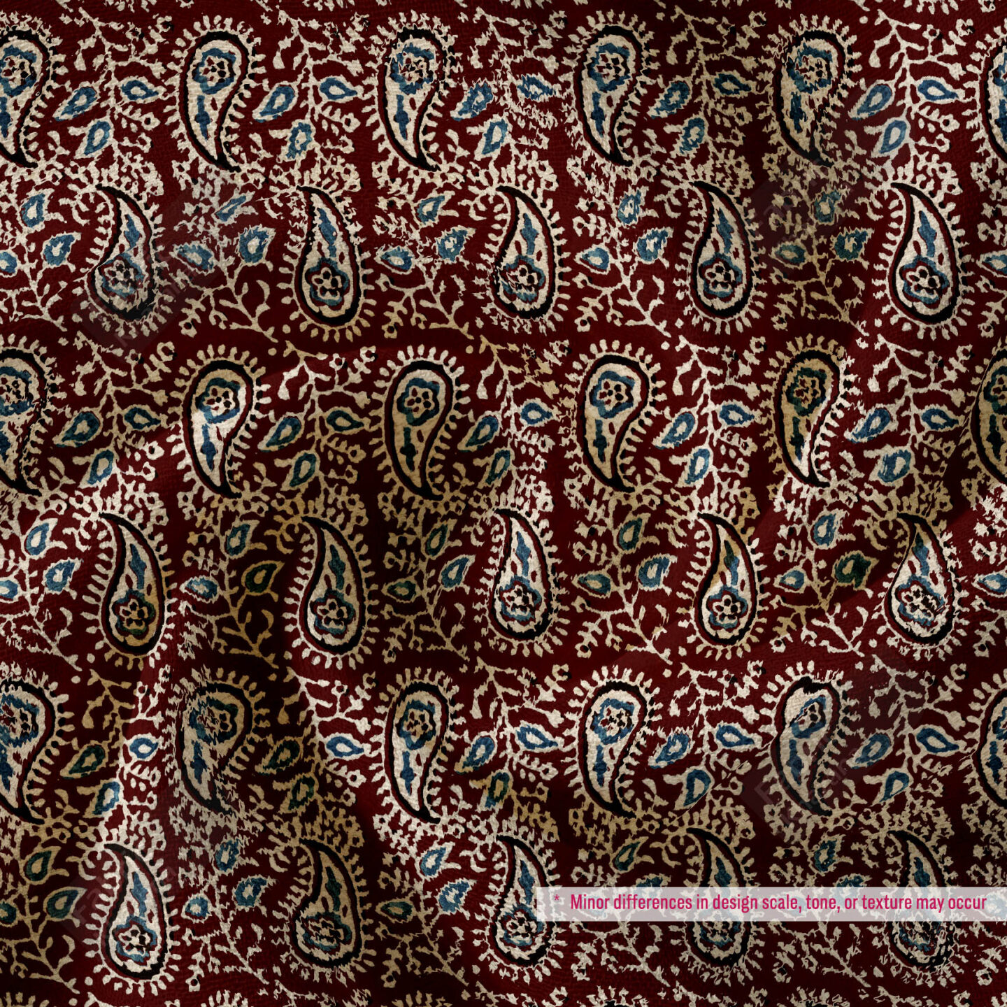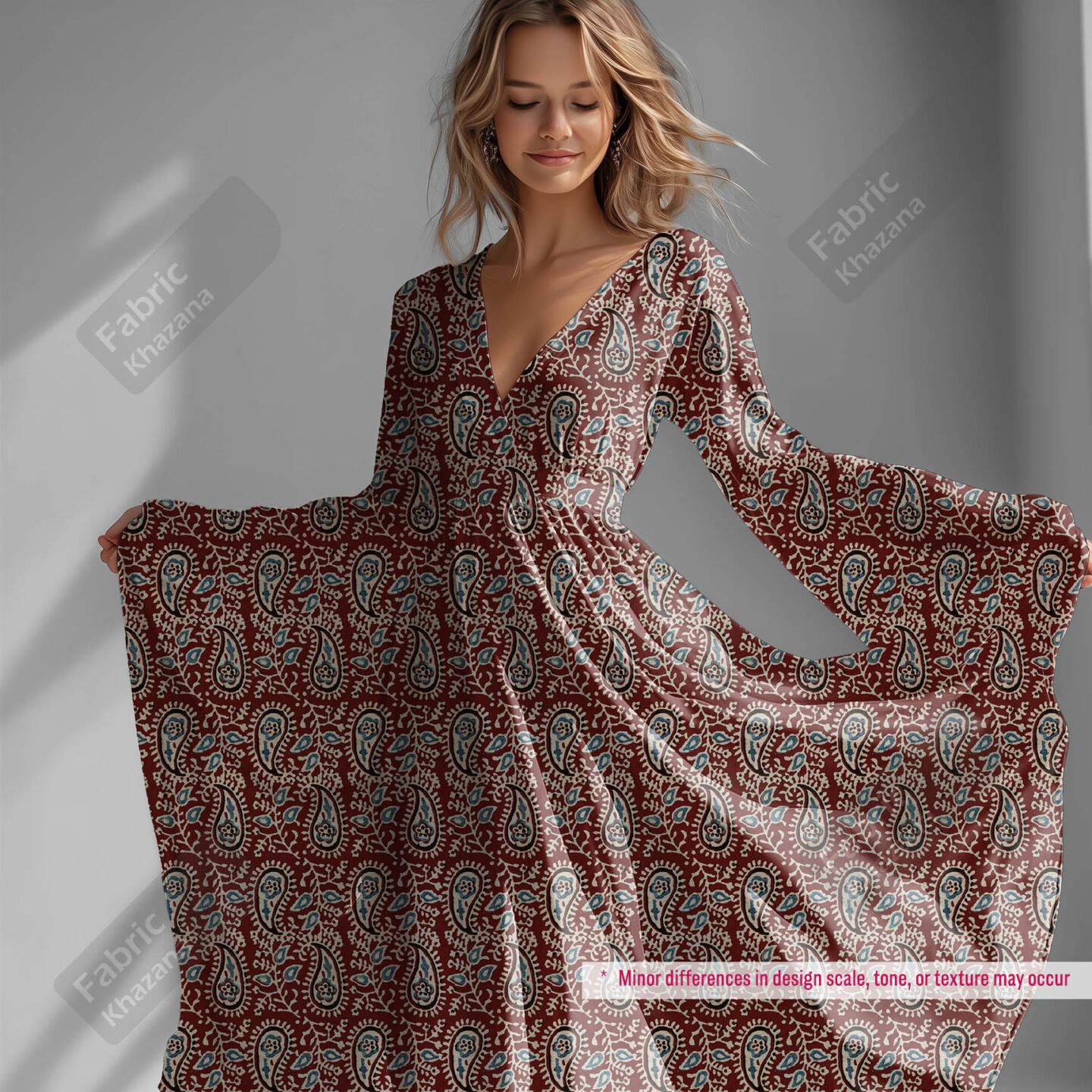 Add a regal touch to your creations with this maroon paisley printed polyester fabric, inspired by classic Indian motifs and modern aesthetics. The intricate blue and beige paisley pattern stands out beautifully against the deep maroon base, creating a luxurious and elegant look that suits all occasions.