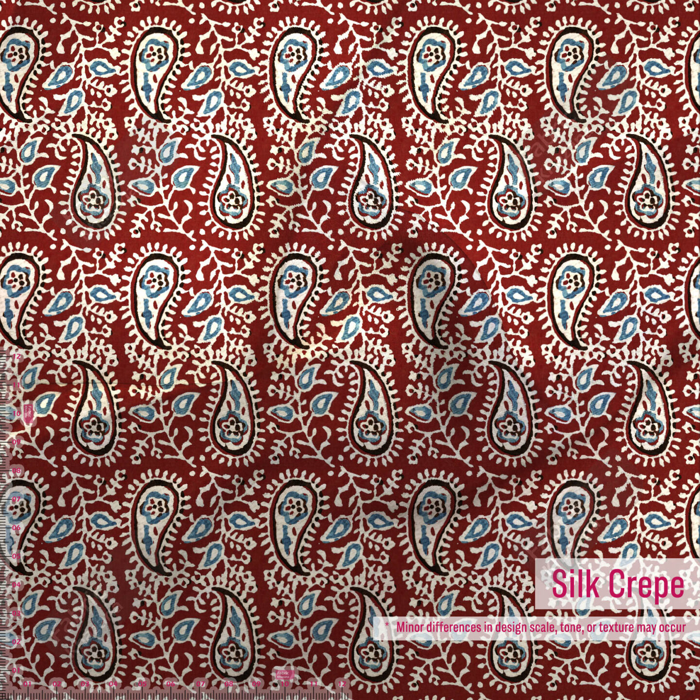 A rich maroon polyester fabric with intricate paisley print and blue floral highlights. Perfect for kurtas, saree blouses, and designer dresses.