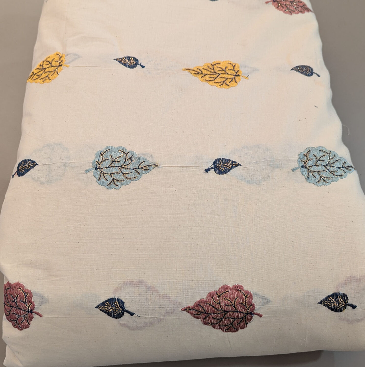 Discover the perfect blend of artistry and comfort with this Premium Natural Cotton Fabric featuring intricate leaf embroidery. Each motif showcases a mix of pastel pink, soft blue, deep navy, and bright yellow, enriched with shimmering gold thread that adds a touch of luxury. The white natural cotton background enhances the contrast and gives the fabric a clean, elegant appearance.