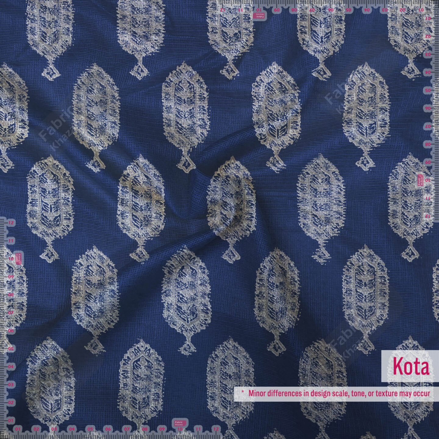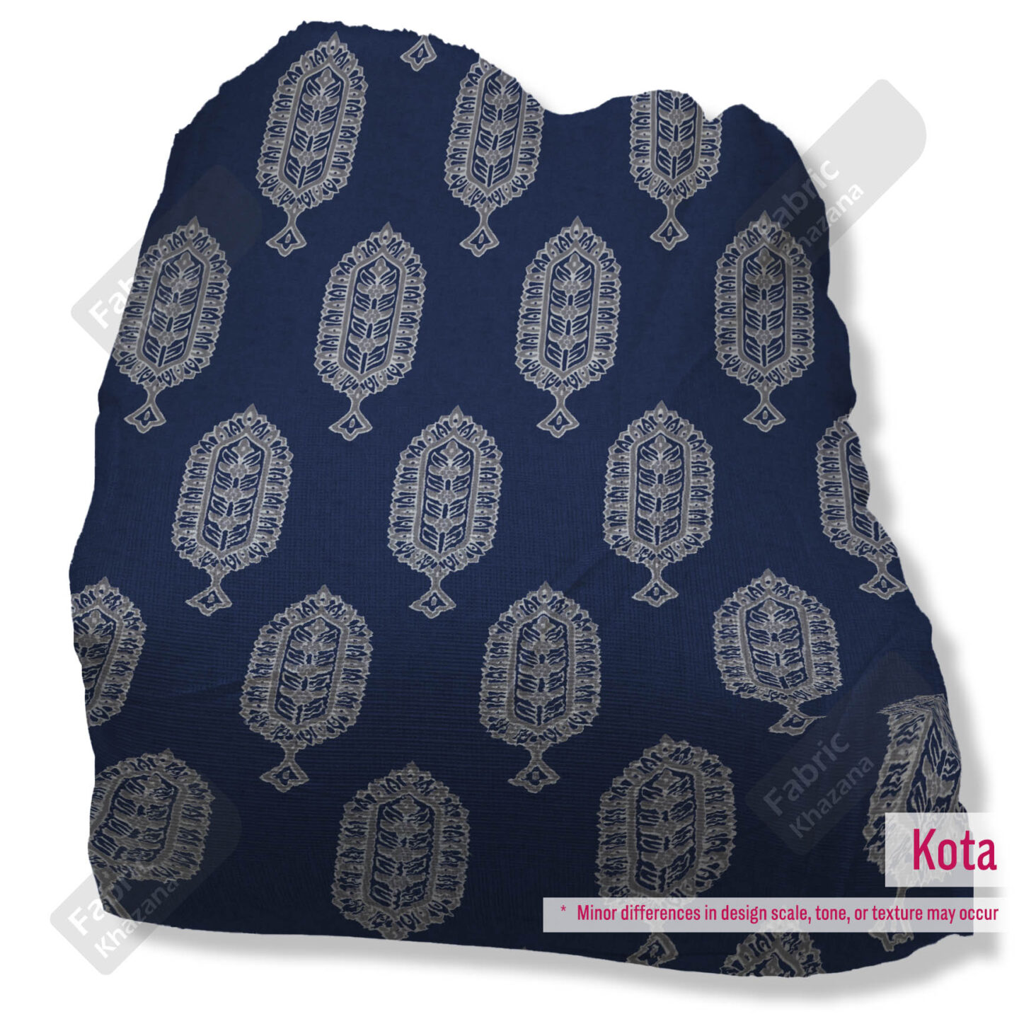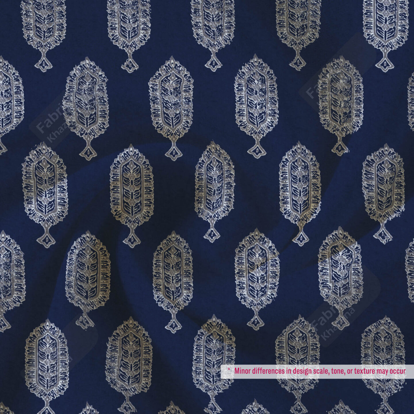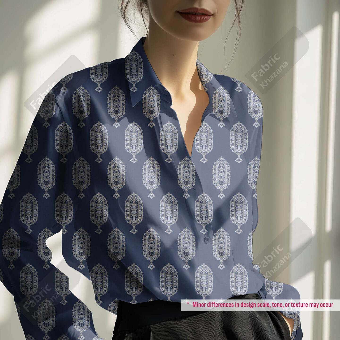 Discover sophistication with this navy blue polyester fabric featuring white leaf motifs. Perfect for ethnic wear, dresses, and home décor projects.