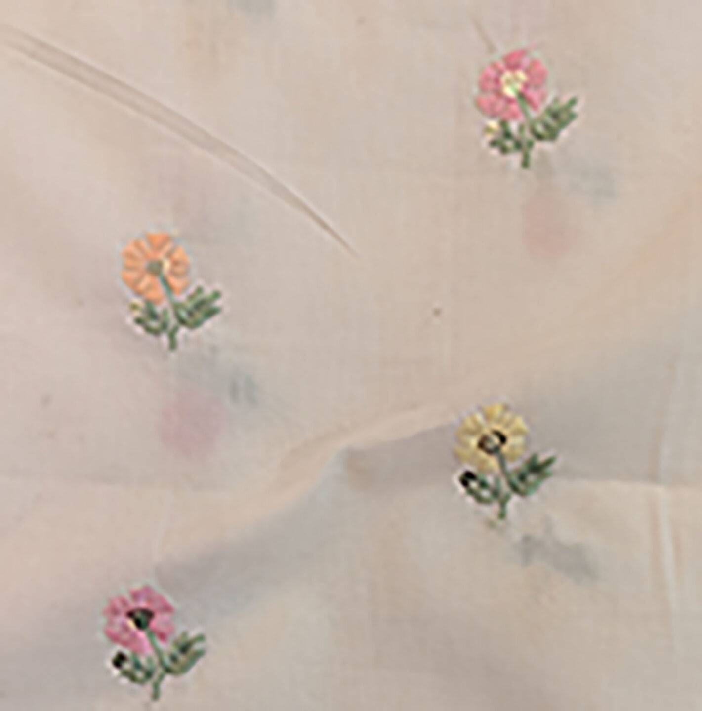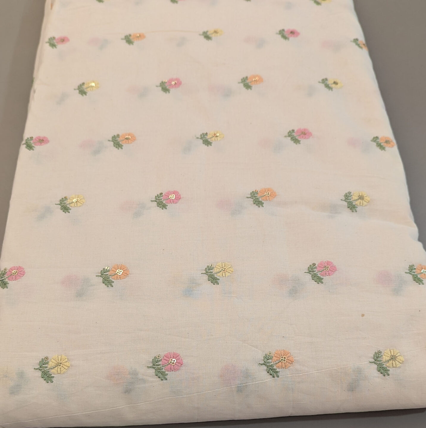 Introduce softness and elegance to your collection with this Natural Cotton Embroidered Fabric designed with delicate pastel floral motifs. The soft white cotton base serves as a clean, airy backdrop to small embroidered butis in peach, pink, and yellow tones, complemented by green leaf detailing. This tasteful embroidery placement offers a minimal yet charming aesthetic, ideal for modern everyday fashion.
