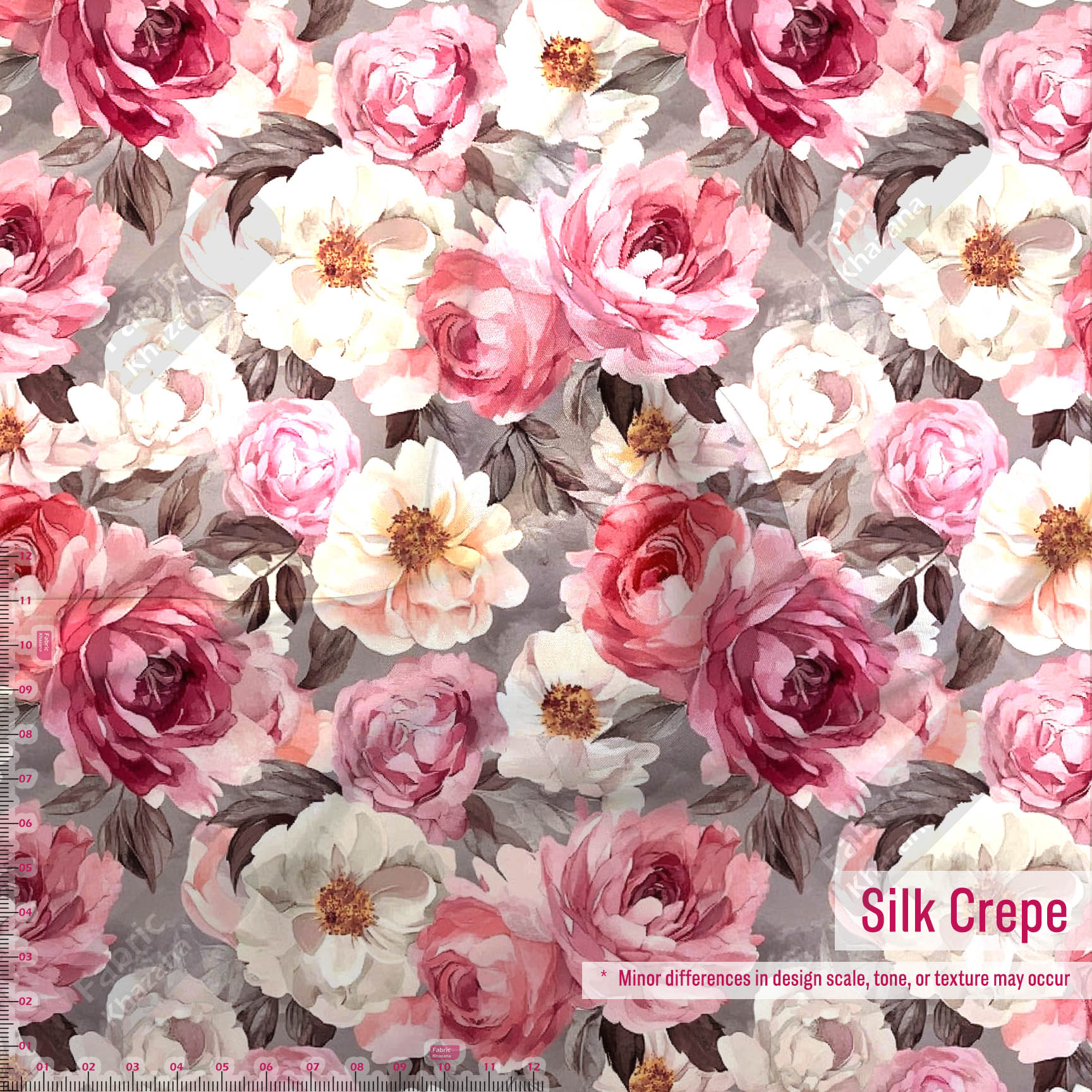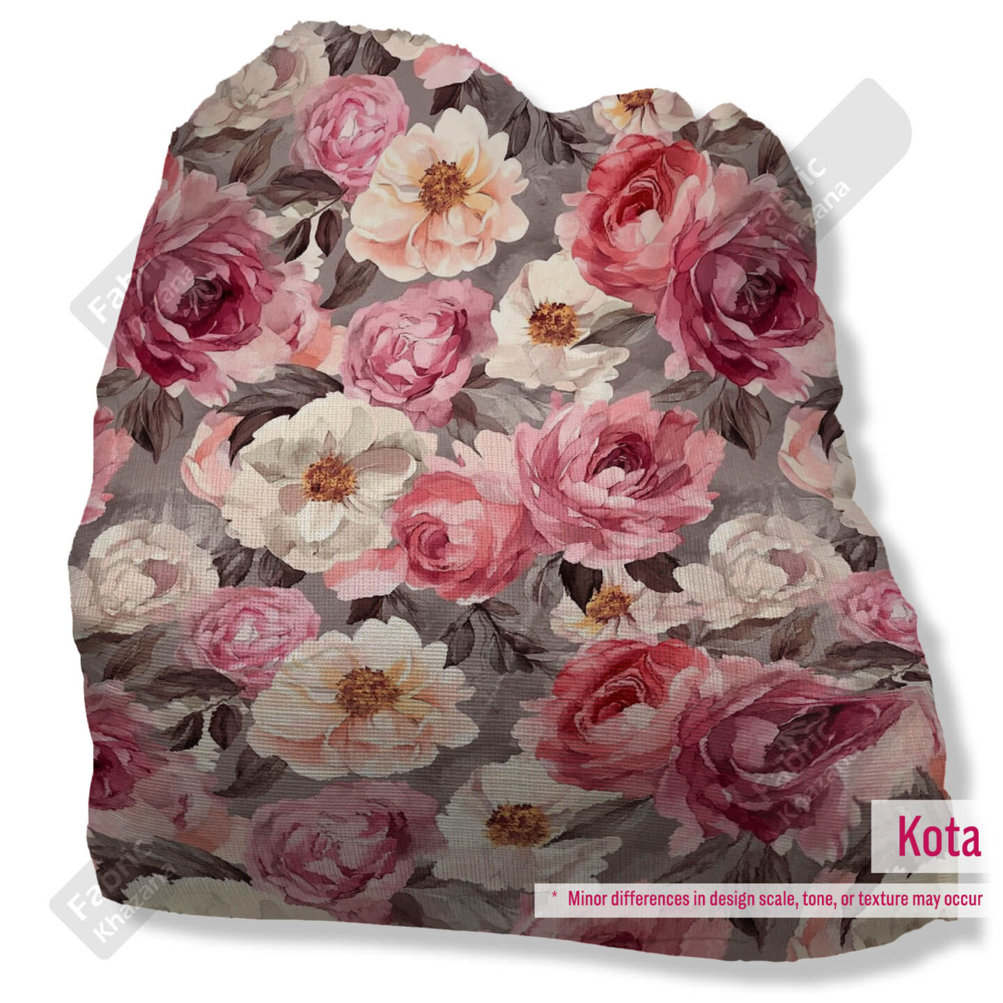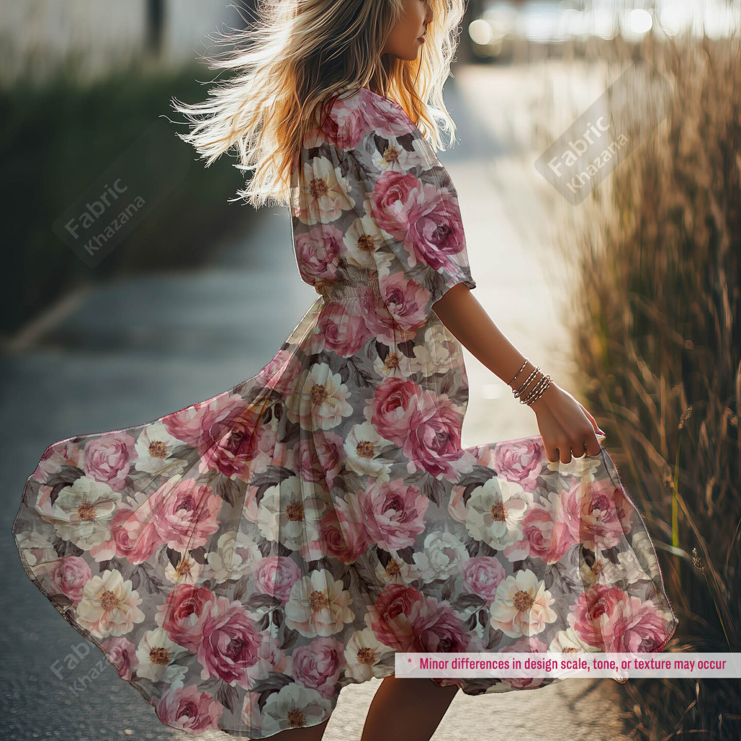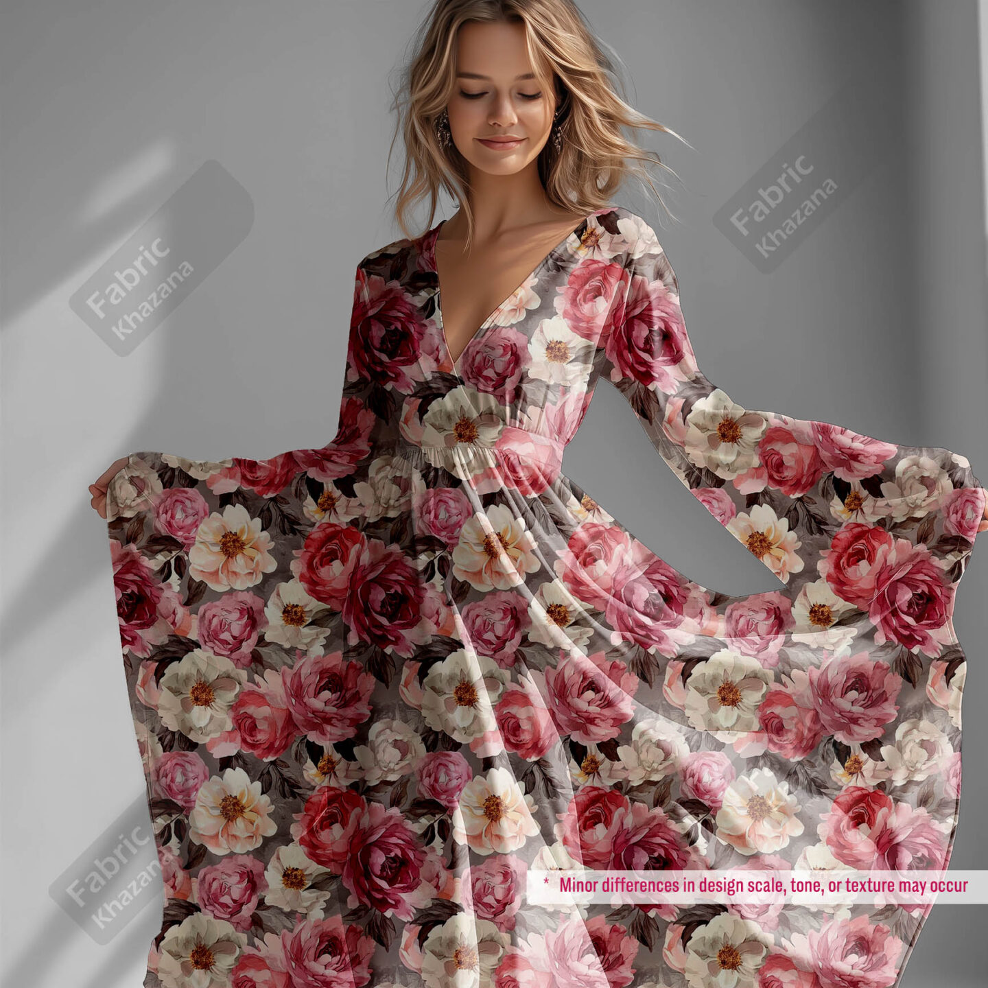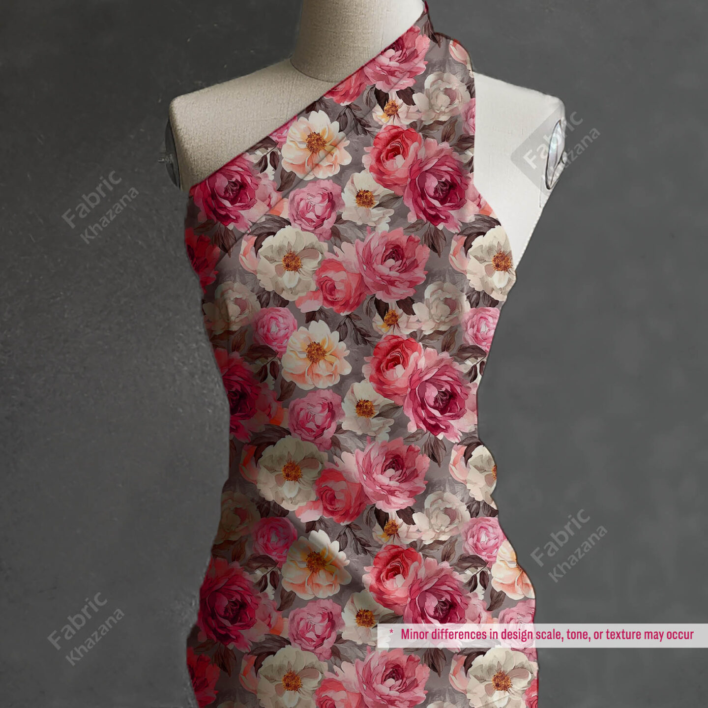 Create timeless fashion with this Pink & Red Rose Bouquet Printed Polyester Fabric, designed with lush layered roses in stunning shades of pink, red, cream, beige, grey, and brown. The watercolor-like strokes make each petal appear soft, realistic, and dimensional, adding sophistication to any garment.