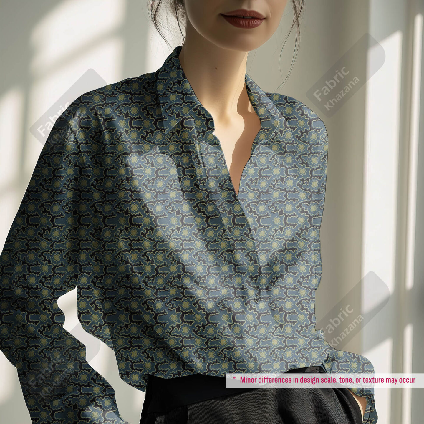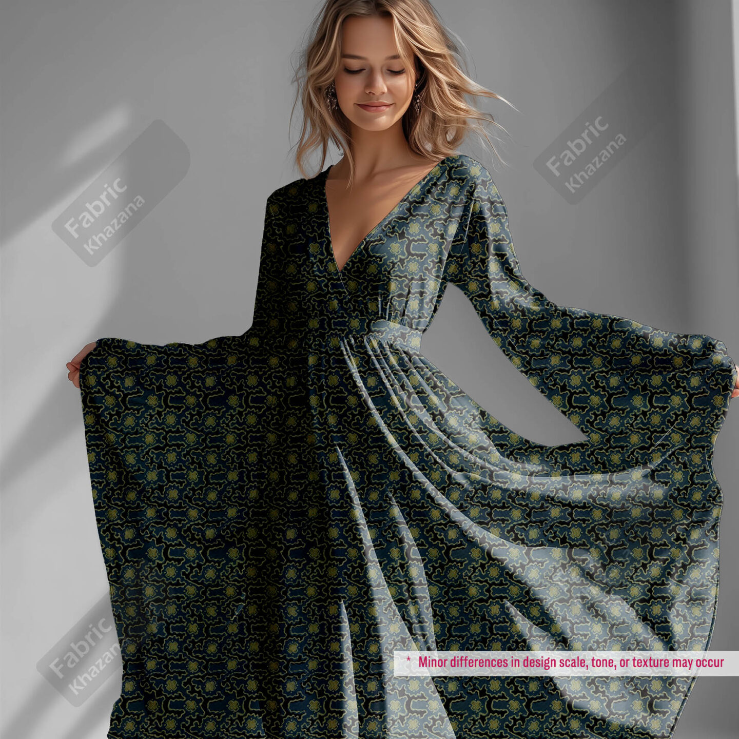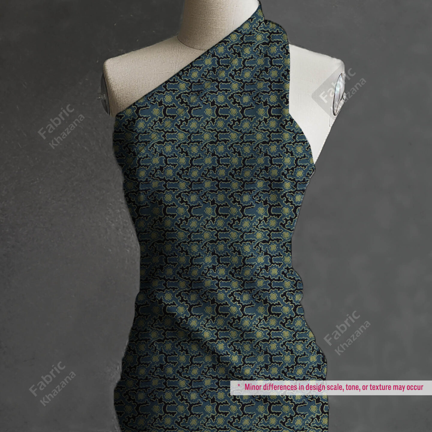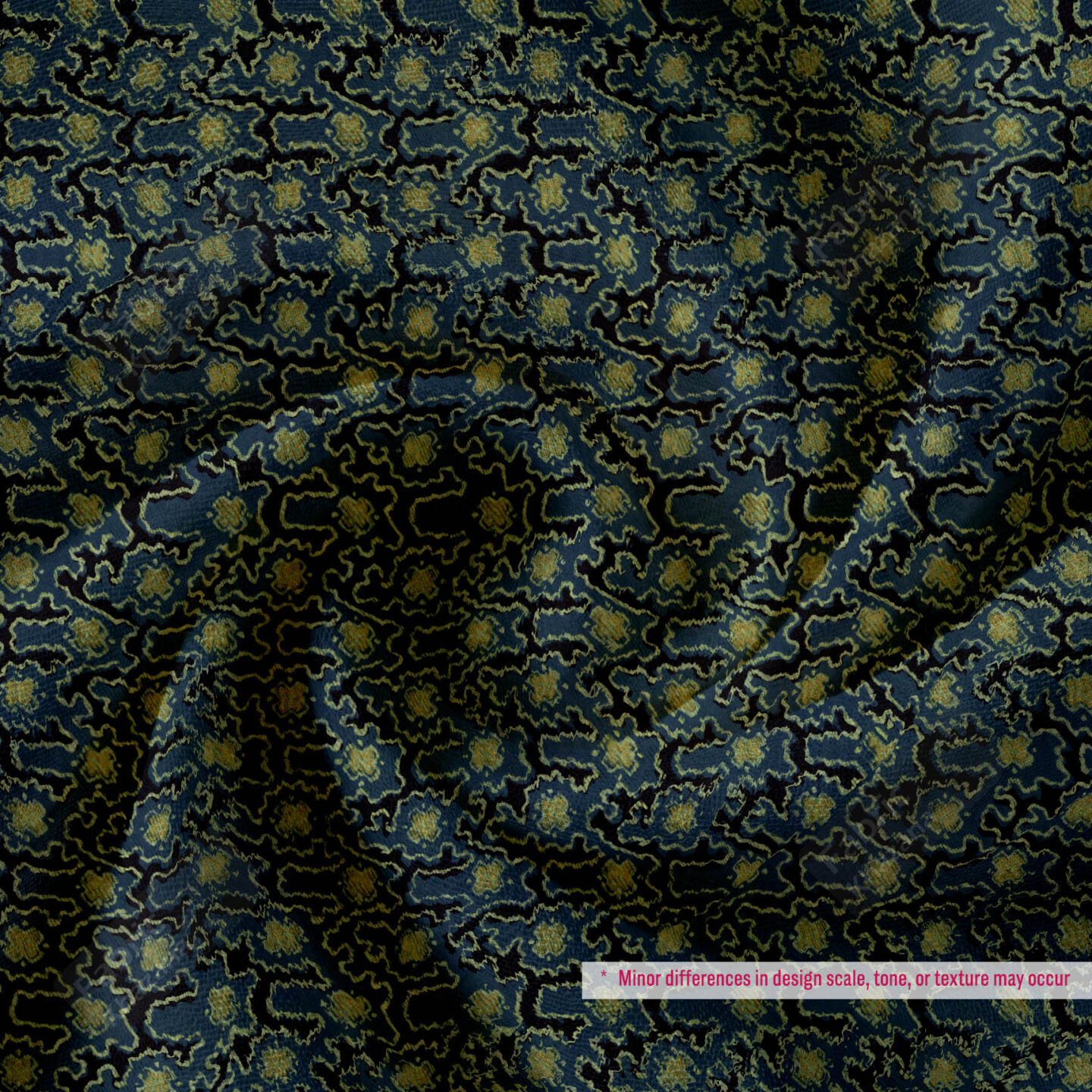 Infuse richness and class into your next creation with this premium navy blue polyester fabric featuring a golden-olive abstract print. Its intricate detailing and lustrous finish reflect the essence of Indian craftsmanship. Ideal for those who love elegant yet practical fabrics, this design offers a perfect blend of tradition and trend.