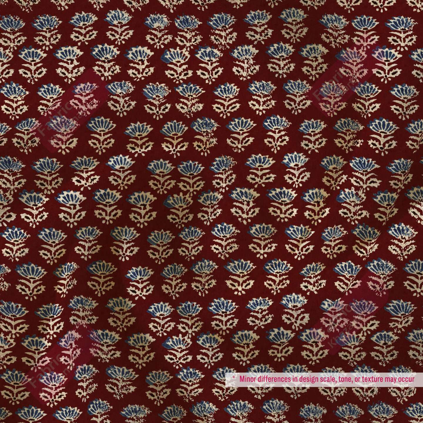 Infuse your wardrobe or living space with the charm of Indian artistry through this maroon polyester fabric with blue and beige floral prints. Crafted with care, the design draws inspiration from classic Indian motifs, giving your creations a rich and cultural vibe.