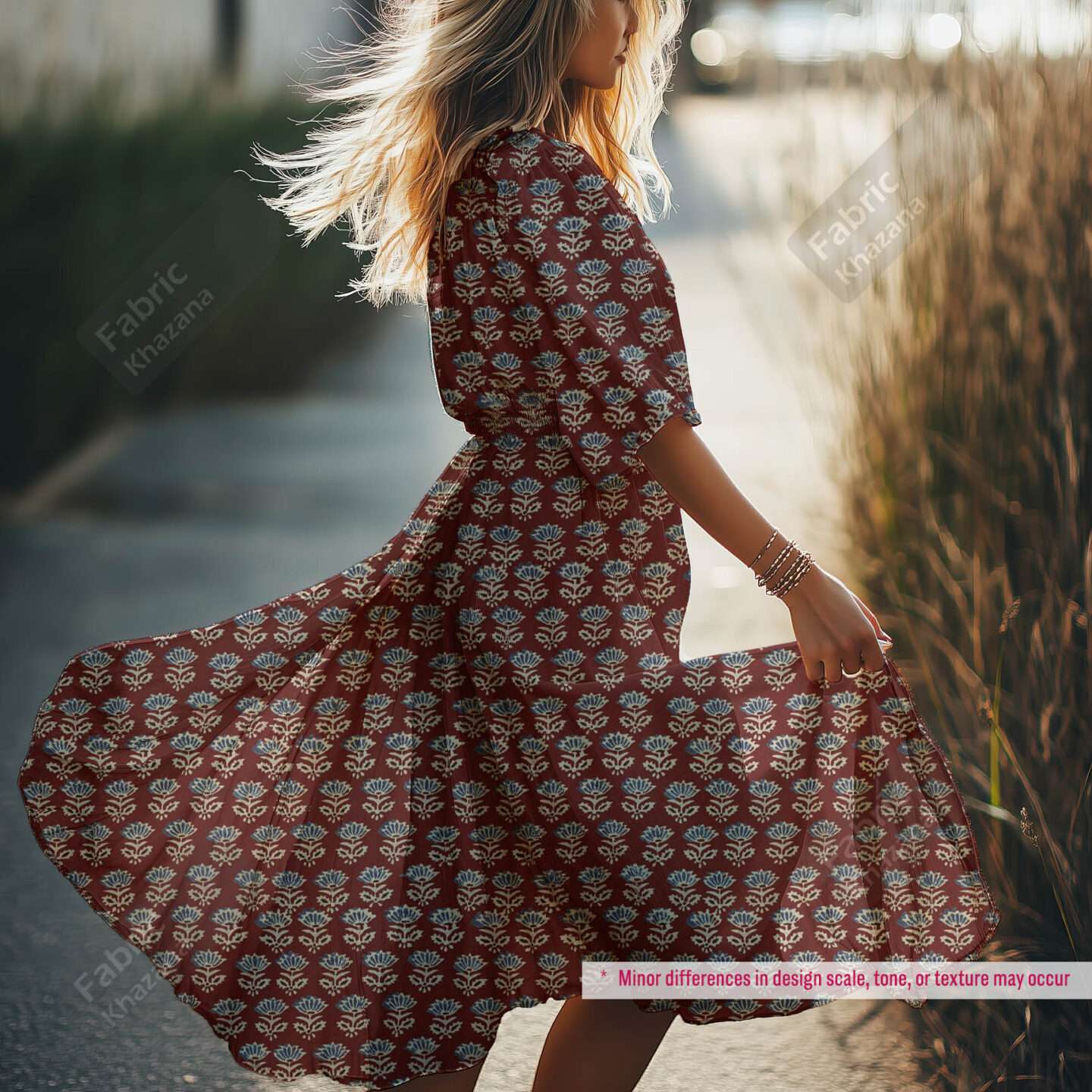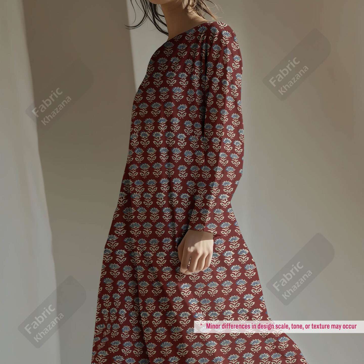 Small Floral Motif Maroon Print Fabric is a perfect choice for those who love understated elegance with a touch of tradition. Featuring delicate floral motifs spread across a rich maroon base, this fabric exudes charm and versatility. Its soft texture and breathable quality make it comfortable for everyday wear while maintaining a refined look. Ideal for designing kurtis, blouses, dresses, skirts, and ethnic wear, it also works beautifully for fusion styles. The classic maroon shade combined with subtle floral detailing makes this fabric suitable for both casual and semi-formal occasions, offering timeless appeal for fashion lovers.