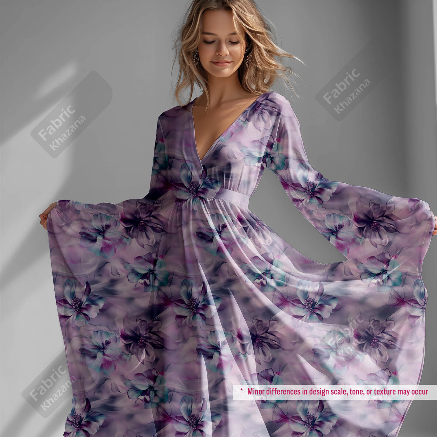 Discover the artistic beauty of this Soft Purple Floral Digital Print Polyester Fabric, created for those who love subtle yet expressive florals. The gentle swirl of purples paired with teal accents creates a dreamy canvas that flows effortlessly with movement. The shading gives the fabric depth, making each flower appear delicately hand-painted.