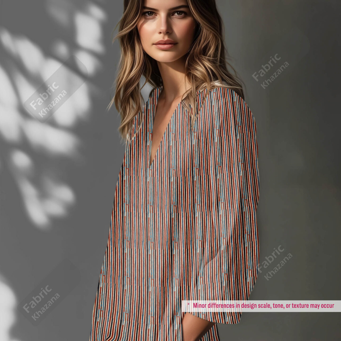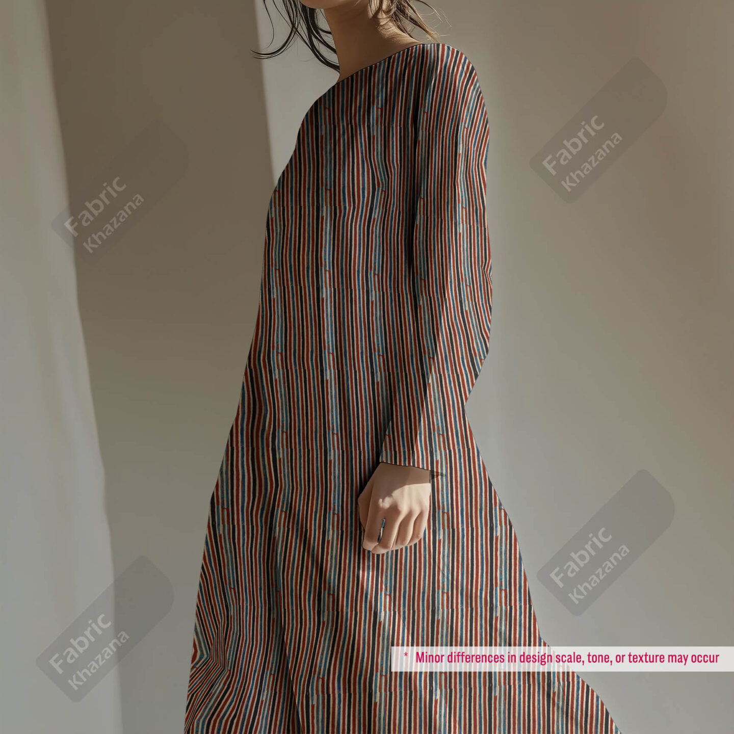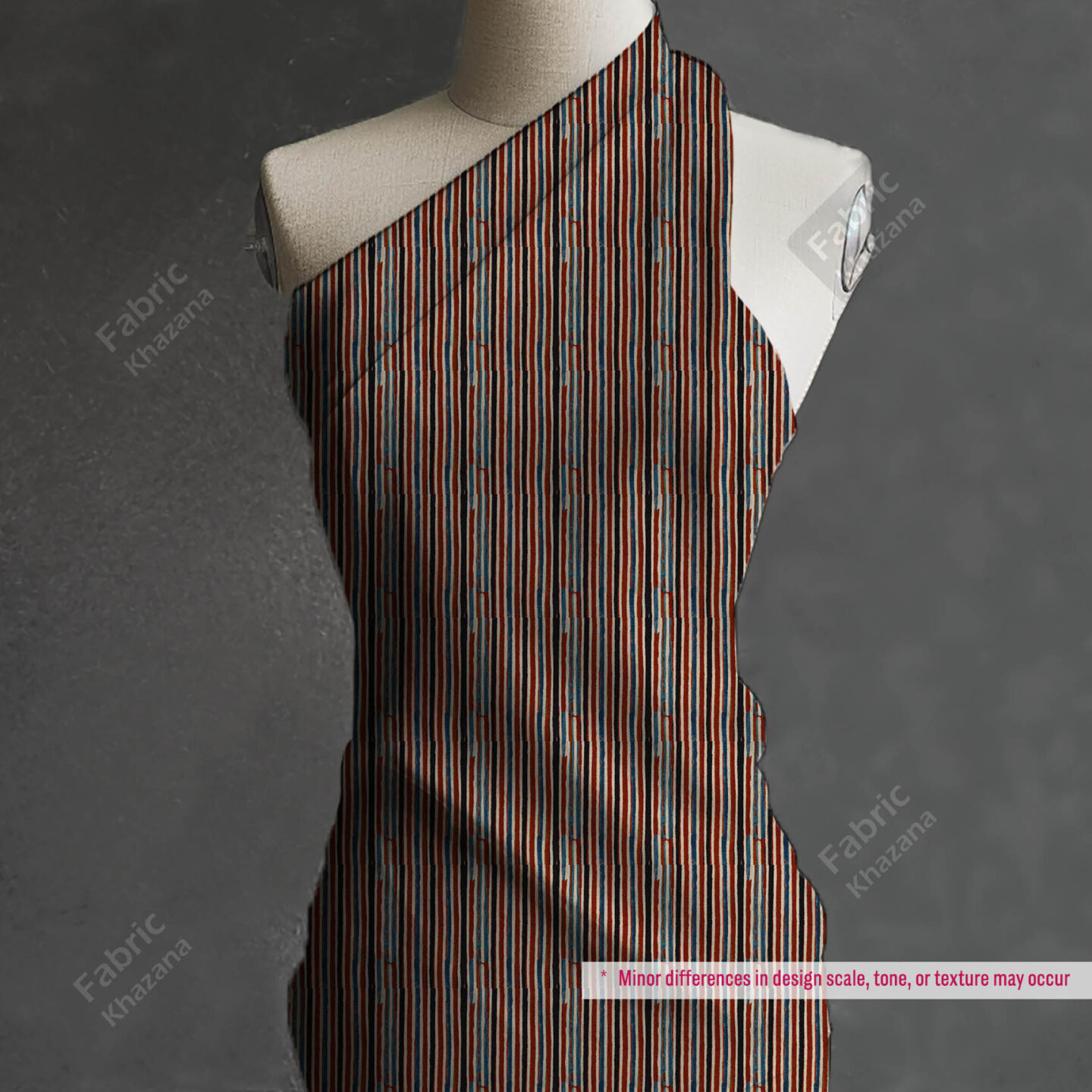 Celebrate bold design with this vibrant striped polyester fabric featuring a striking mix of red, blue, cream, and brown tones. The vertical stripe pattern offers a flattering, elongated look, making it perfect for stylish kurtas, maxi dresses, shirts, or skirts.