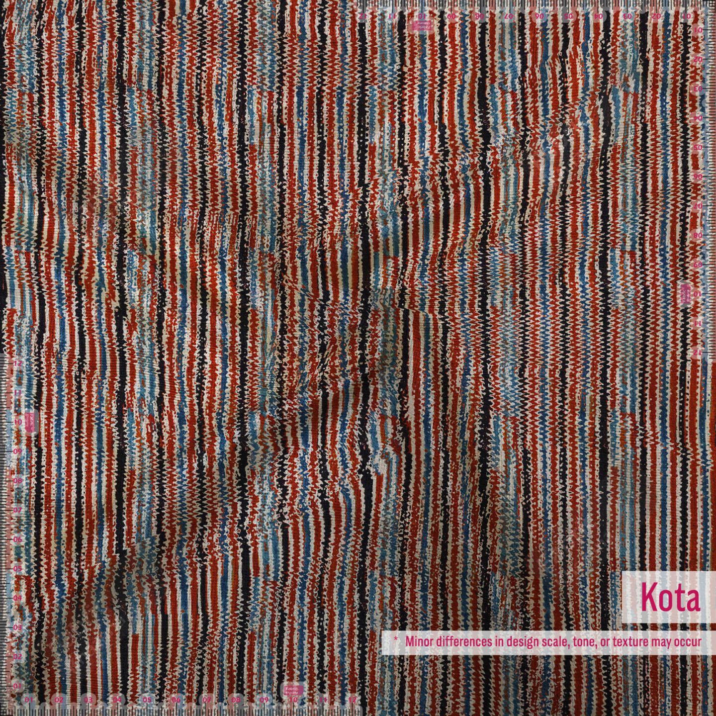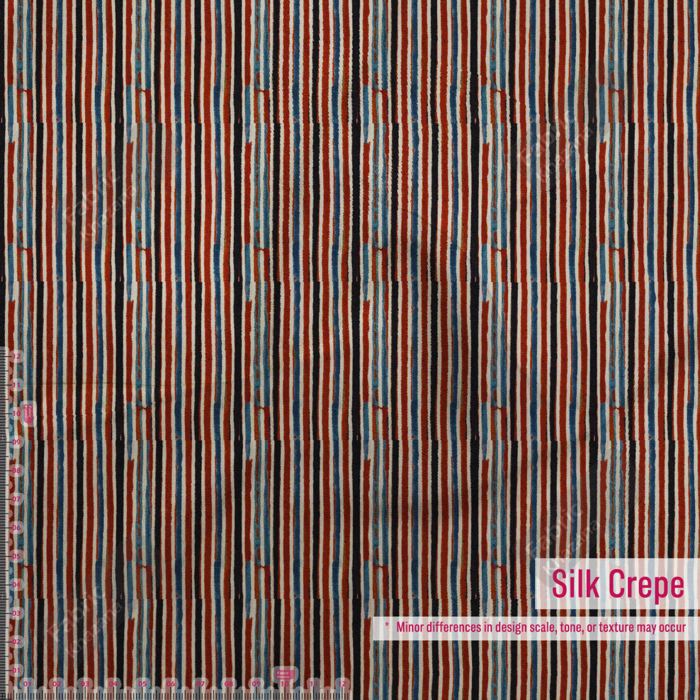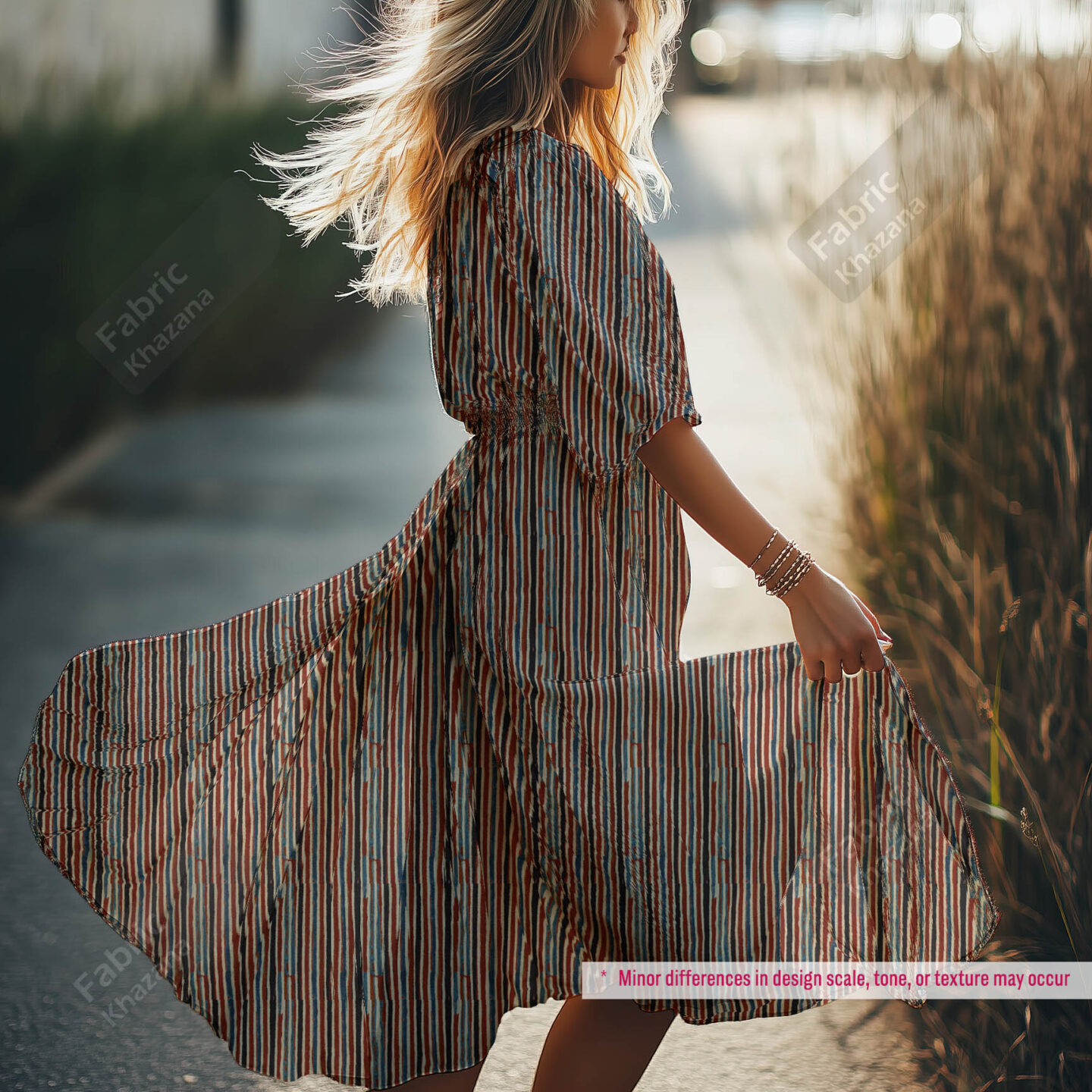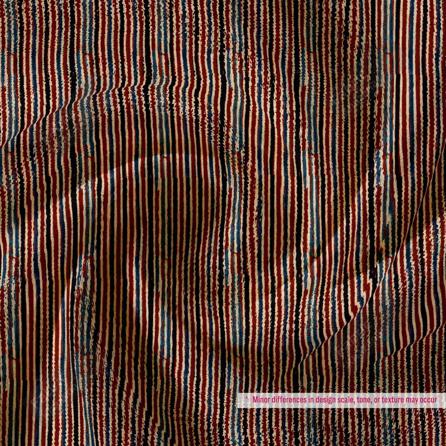 Celebrate bold design with this vibrant striped polyester fabric featuring a striking mix of red, blue, cream, and brown tones. The vertical stripe pattern offers a flattering, elongated look, making it perfect for stylish kurtas, maxi dresses, shirts, or skirts.